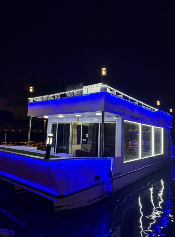 Experience premium comfort with our Luxury White House Boat, one of the top choices for dhow cruise canal deals in Dubai. Enjoy access to the fully air-conditioned lower deck and open upper deck, a delicious 5-star buffet dinner (veg & non-veg), welcome drink, unlimited soft drinks, and a captivating Tanoura dance show. Departing from Al Jaddaf, this spacious dhow (120 pax capacity) offers separate restrooms for men and women—perfect for a smooth and memorable dhow cruise experience.